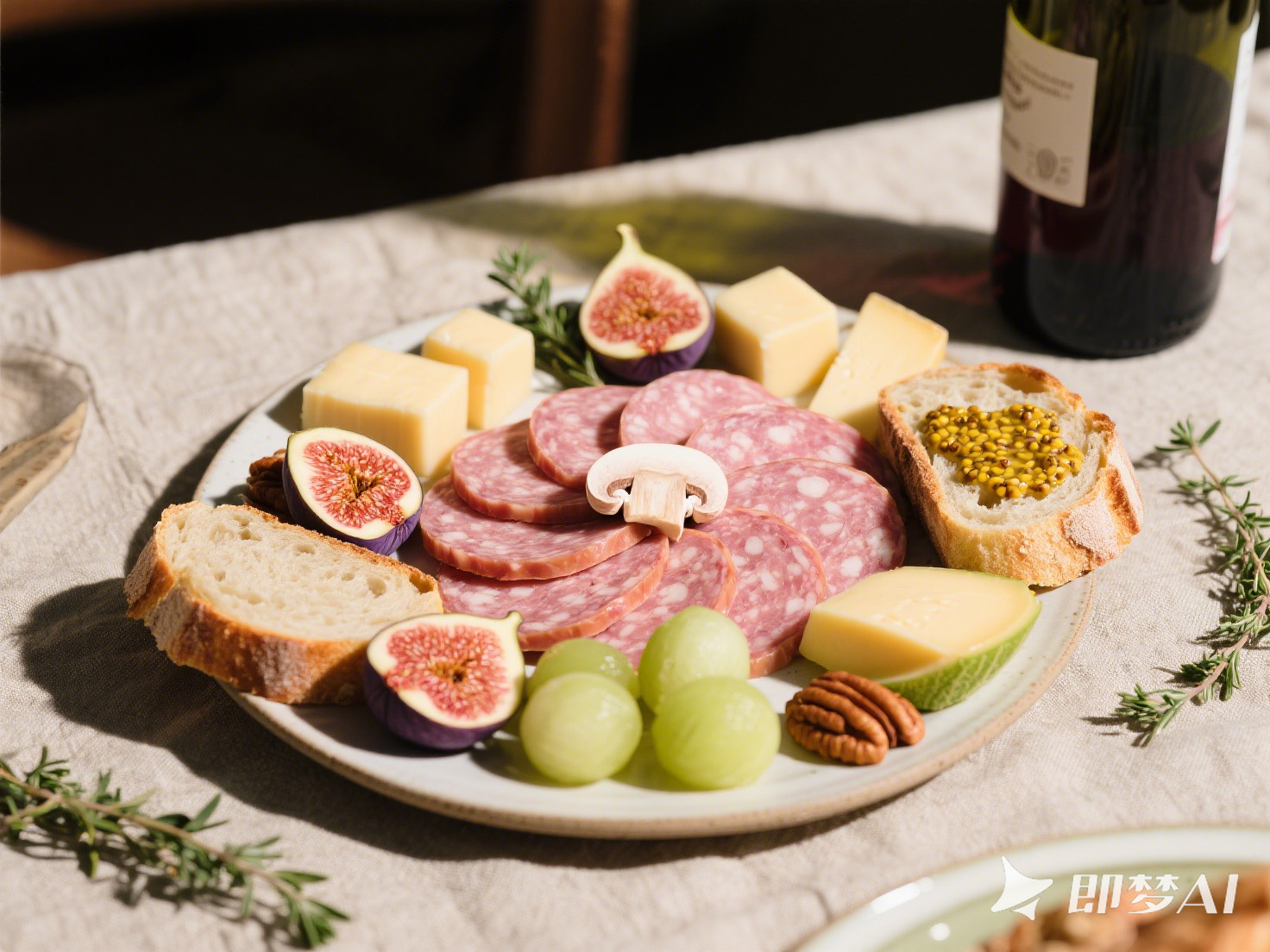 ② 使用淺色大理石板或木質(zhì)長盤,將香腸片、奶酪塊、水果、堅(jiān)果分區(qū)擺放,形成色彩與質(zhì)感的對比。
