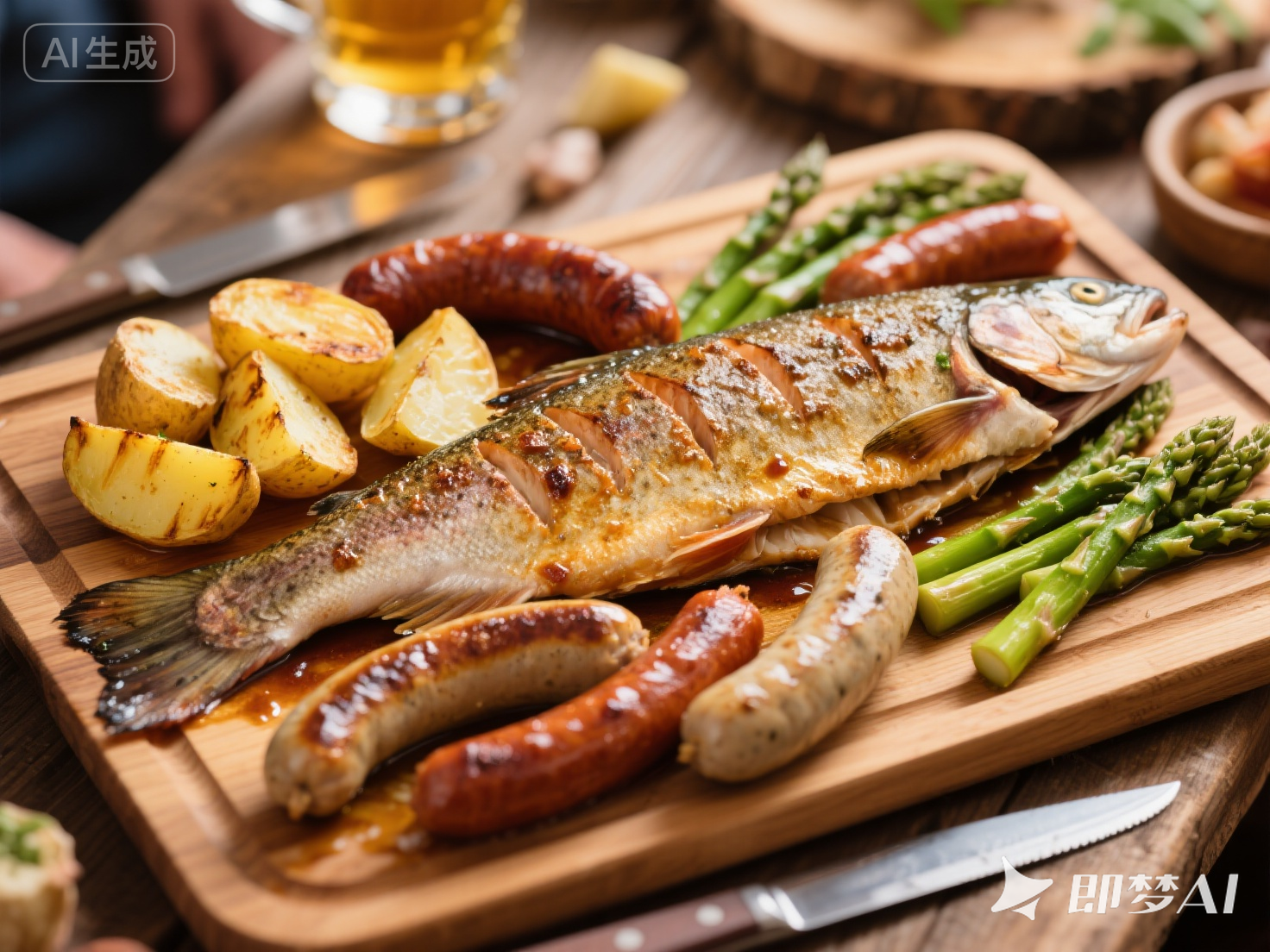 ④ 組合拼盤:取一個(gè)大號(hào)木質(zhì)砧板或長盤,將加熱好的虹鱒魚、香腸、烤土豆和蘆筍豪邁地?cái)[放上去,營造豐盛的分享氛圍。