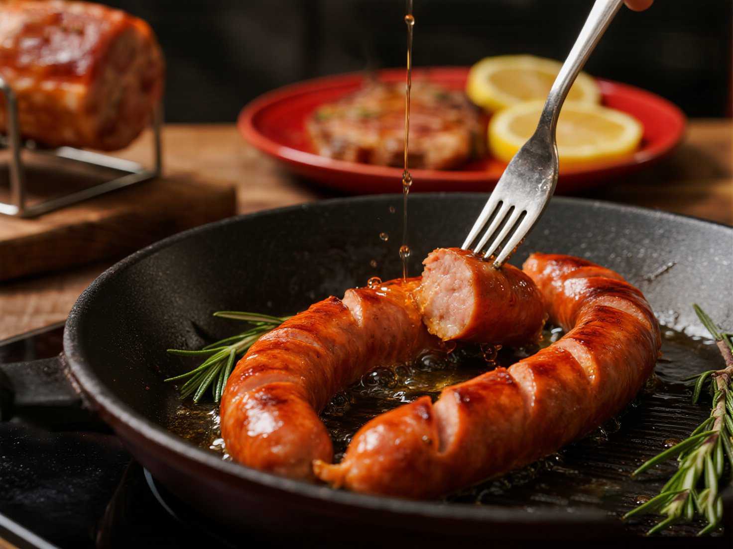 ①冷鍋刷油,放入香腸,兩面煎至焦黃,加入少許水,蓋上鍋蓋水煎,小火慢煎8分鐘左右,直至熟透 → ②香腸切段擠上檸檬汁,開吃!