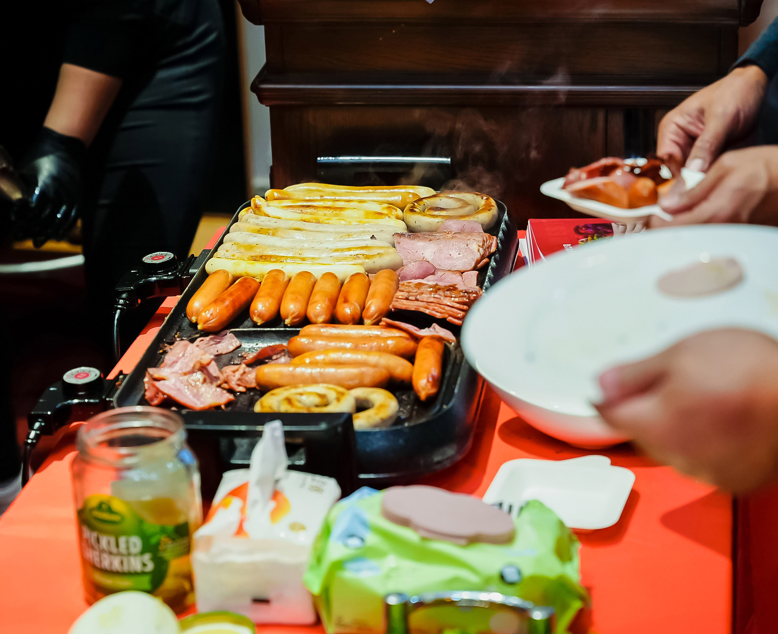 剛剛結(jié)束比賽的運(yùn)動員、忙碌的工作人員與興致勃勃的游客們紛紛被吸引至我們的展位。大家品嘗到熱騰騰、肉汁飽滿的香腸與焦香適宜的培根,更可現(xiàn)場購買,將這份便捷與美味帶回家。我們的展位前一度排起長隊(duì),成為了市集中一道亮麗的風(fēng)景線和溫暖的補(bǔ)給站。